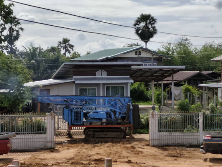 In die angehobene Grundfläche werden nun die Eisenbetonpfähle gerammt.